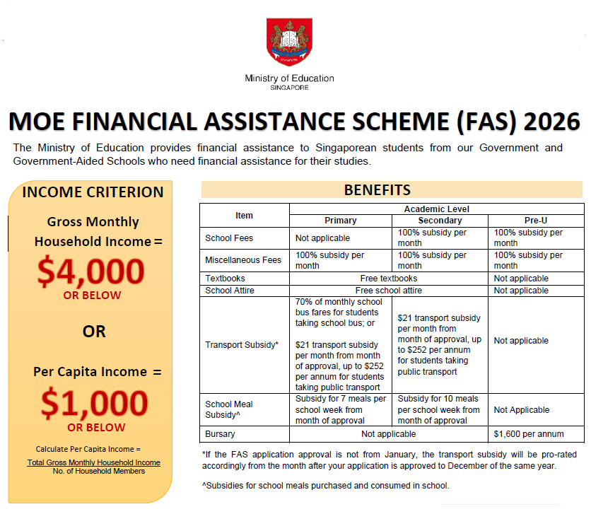 For more information, please refer to the MOE FAS Pamphletand: MOE Website โ Financial Assistance Scheme
